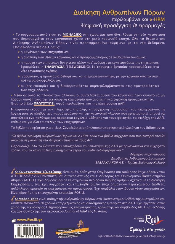 Το βιβλίο "Διοίκηση Ανθρωπίνων Πόρων (e-HRM)" προσφέρει μια σύγχρονη και ολοκληρωμένη προσέγγιση στη διοίκηση ανθρώπινων πόρων, με έμφαση στην ενσωμάτωση των ψηφιακών τεχνολογιών και των εφαρμογών e-HRM. Συνδυάζει τις παραδοσιακές στρατηγικές διοίκησης με τις σύγχρονες πρακτικές που επιβάλλονται από την ψηφιοποίηση και την τεχνολογική εξέλιξη, καλύπτοντας τις ανάγκες των οργανισμών και των επιχειρήσεων στον σημερινό επιχειρηματικό κόσμο.